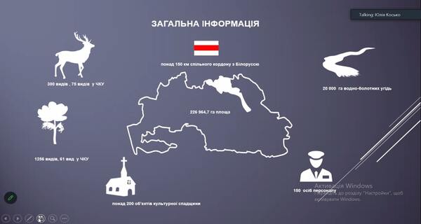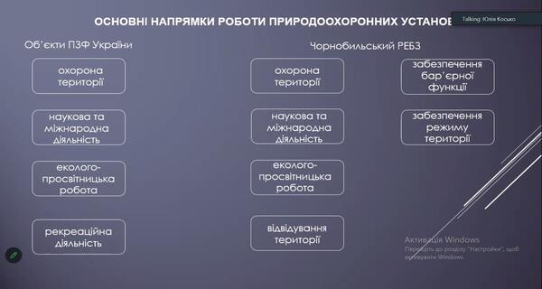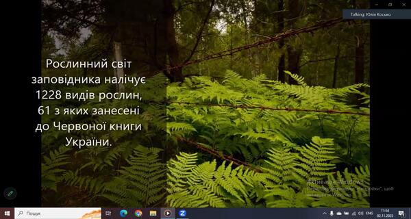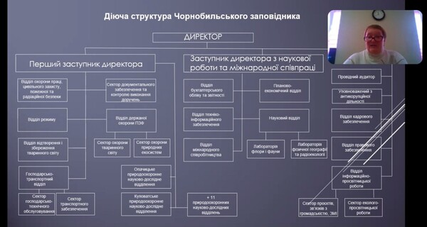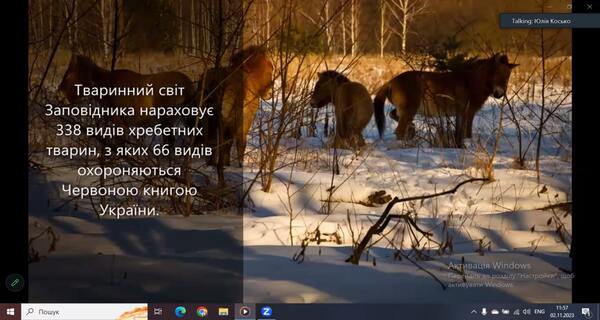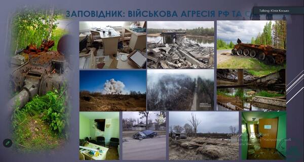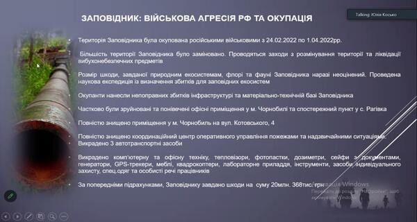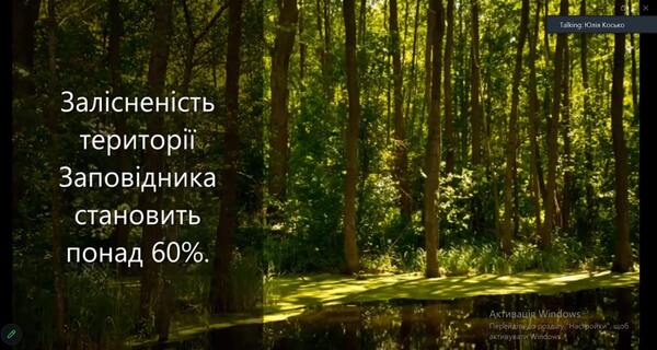В ході заняття розглянули і обговорили структуру та особливості функціонування заповідника до війни і в умовах військового стану. Було розглянуто основні напрямки роботи заповідника, а також детально ознайомлено з територією заповідника, на якій розташовано територія Смарагдової мережі Європи. Під час заняття студенти мали можливість відвідати онлайн-екскурсію в Чорнобильський радіаційно-екологічний біосферний заповідник. Фахівець заповідника Юлія Сергіївна Косько наочно продемонстрували флору та фауну Чорнобильського заповідника, яка була зафіксована за допомогою фотопасток. Студенти мали можливість задавати питання, які стосуються не лише особливостей функціонування біосферного заповідника в умовах військового стану, а й питання щодо працевлаштування.