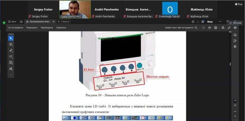 Практичне заняття складалося з пояснення основ програмування мовою LD та вивчення Zelio Soft 2 як спеціалізованого середовища розробки для ПЛК серії Zelio Logic від Schneider Electric з демонстрацією роботи ПЛК на навчальному стенді.