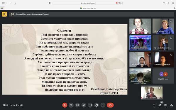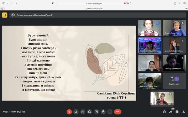 Розглядалася українська поезія ХХІ ст., зокрема вірші періоду російсько-української війни. Обговорювався такий жанр постмодерної поезії як верлібр. Семінар завершили студенти декламуванням власної поезії на тему кохання, рідної мови та України.