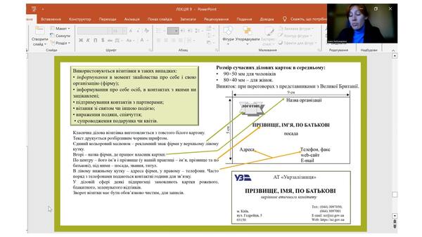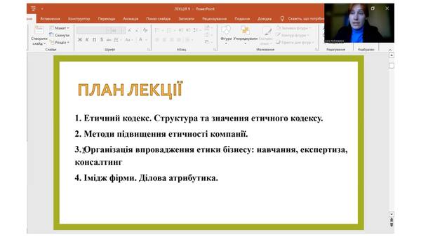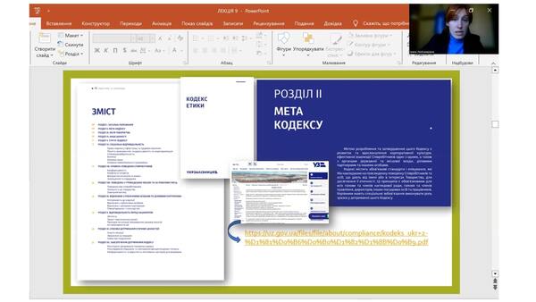 Впродовж лекції студенти мали змогу розглянути етичний кодекс як стандарт, що описує загальну систему цінностей, етичних правил, яких мають дотримуватись працівники організації. Вивчення структури та значення кодексів етики відбувалось на основі аналізу Кодексу етики АТ «Укрзалізниця». Також студенти дослідили методи підвищення етичності компанії та проаналізували особливості організації впровадження етики бізнесу. Ознайомились із поняттями іміджу та репутації, їх складовими та особливостями, а також розглянули ділову атрибутику та її місце в оцінці іміджу. Навчилися розробляти візитівку на прикладі візитівки працівника АТ «Укрзалізниця».