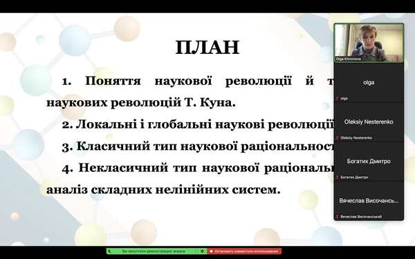 Аспіранти впродовж лекції активно долучалися до обговорення проблемних питань щодо зміни однієї наукової картини світу іншою, наводили приклади наукових теорій, що згодом спричинили локальні чи глобальні наукові революції, дискутували щодо повного чи часткового заперечення попередніх типів наукової раціональності в процесі їх революційної трансформації.