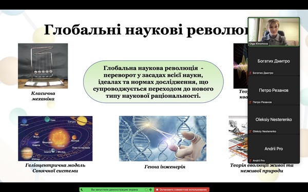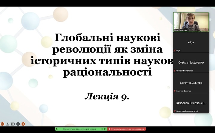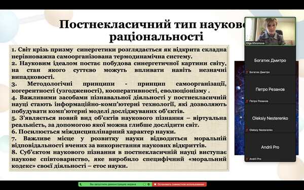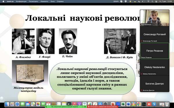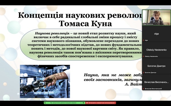 08.12.2023Впродовж лекції аспіранти дізналися, яким чином відбуваються зміни наукової картини світу; познайомилися з концепцією наукових революцій Т. Куна; актуалізувавши матеріал всіх природничих наук, які вивчалися раніше, визначили найбільш відомі локальні наукові революції та з’ясували основний зміст та світоглядне значення всіх глобальних наукових революцій в історії науки. Також здобувачі третього рівня вищої освіти дізналися про основні типи наукової раціональності та їхні особливості, і простежили взаємозв’язок між науковими революціями та зміною відповідних типів наукової раціональності в процесі розвитку наукового пізнання.