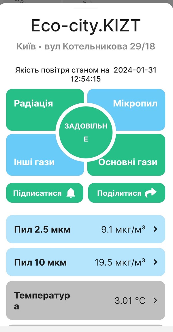 Технічний експерт проєкту “Чисте повітря для України” додав, що станція моніторингу повітря EcoCity також має оптичний сенсор дрібнодисперсного пилу, який визначає дві фракції дрібнодисперсного пилу розміром PM2,5 мікрометра і PM10 (10 мікрометрів). Зокрема встановлений і газоаналізатор, який створений на базі металооксидного сенсора, що визначає концентрації таких шкідливих газів, як чадний газ, діоксид азоту та аміак.