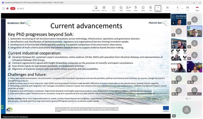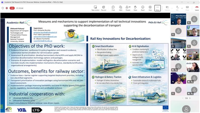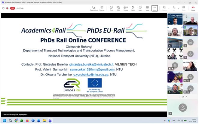 On 10 February 2026, an open international scientific and practical webinar entitled “Academic Rail Research & PhD Showcase Webinar (Academics4Rail + PhDs EU-Rail)” was held. The event presented the results of doctoral research in the field of railway transport carried out within the European research initiatives Academics4Rail and PhDs EU-Rail.The webinar brought together PhD students, researchers, representatives of academic institutions, the railway industry, experts, and stakeholders from various European countries. The webinar brought together more than 100 participants, including PhD students, researchers, representatives of academic institutions, the railway industry, experts, and stakeholders from various European countries. The aim of the event was to introduce a broad professional audience to current research directions focused on innovation-driven development and the sustainable transformation of railway transport.During the webinar, PhD candidates from two international programmes presented their research.Academics4Rail (6 PhD projects):