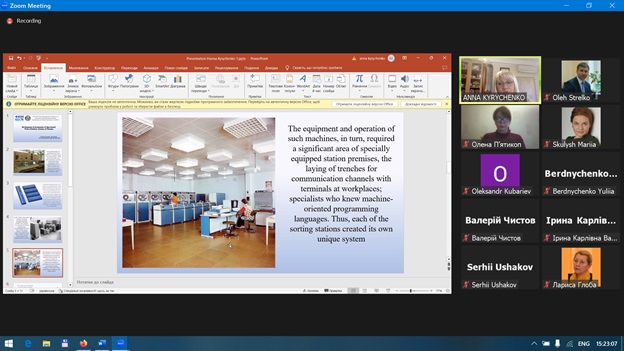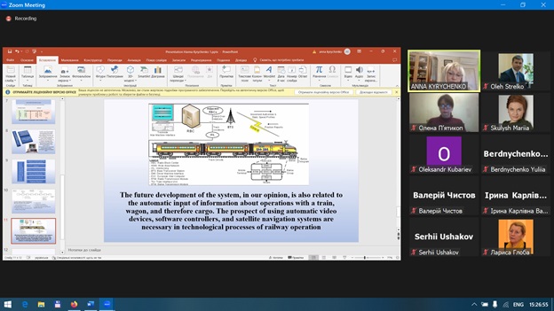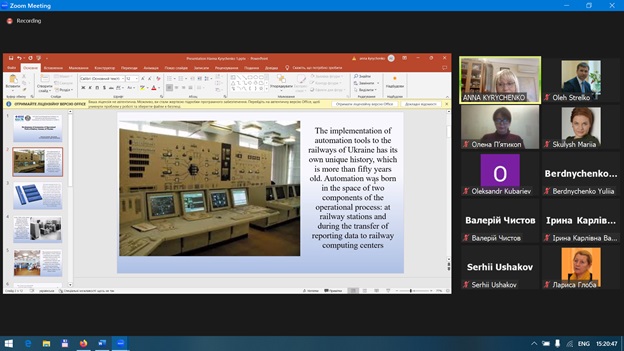 Ганна Кириченко виступила з доповіддю на тему: «Розвиток автоматизації експлуатаційної роботи залізничних вокзалів України», де було розглянуто етапи впровадження обчислювальної техніки на залізничних станціях, визначено принциповий склад автоматизованих систем управління та інші актуальні питання розвитку транспортних технологій.